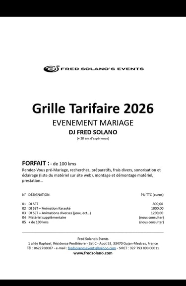 Fred Solano's Events est une association qui a pour mission d'organiser des évènements publiques ou privés (DJ Set, Karaoké, Mariage, Anniversaire, Sonorisation, ect...)